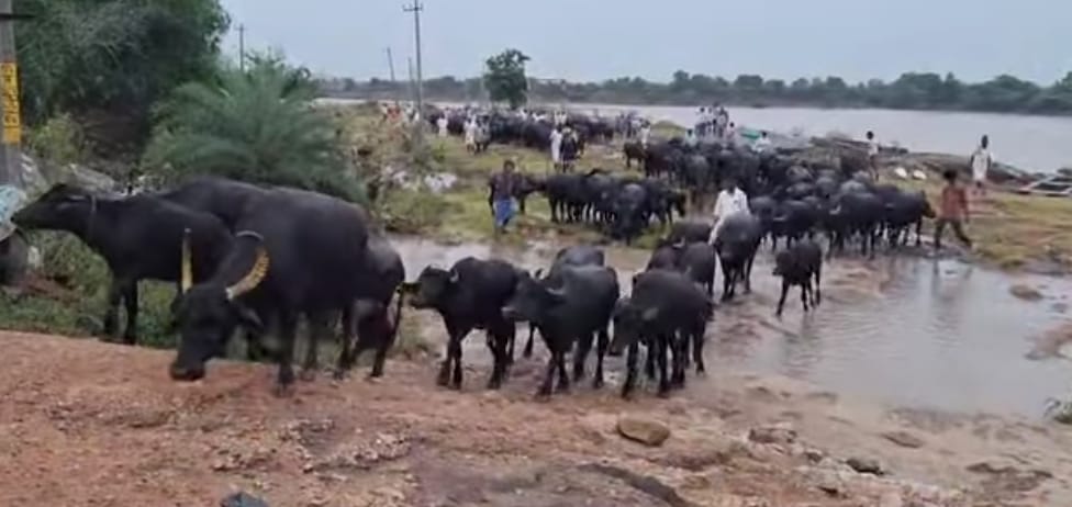 Buffaloes Rescued from Godavari Floods: వారం రోజులుగా కురిసిన భారీ వర్షాలకు లక్ష్మణచాంద మండలం మునిపెల్లి, మాచాపూర్ గ్రామాలకు చెందిన సుమారు 300 బర్రెలు గోదావరి మధ్యలోని కుర్రులో చిక్కుకున్నాయి. గోదావరి ఉగ్రరూపం దాల్చి ప్రవహించడంతో పశువులు బయటకు వెళ్లలేక కుర్రులోనే ఉండిపోయాయి. సుమారు 150 ఎకరాల విస్తీర్ణంలో ఉన్న కుర్రులో 300 బర్రెలు వారం రోజులుగా ఉండిపోయాయి. సోమవారం గోదావరి శాంతించడంతో కొందరు గ్రామస్తులు ధైర్యం చేసి కుర్రుకు వెళ్లి బర్రెలను గోదావరి దాటించారు. దీంతో మాచాపూర, మునిపెల్లి గ్రామాల ప్రజలు ఊపిరి పీల్చుకున్నారు. ఇరు గ్రామాల నుంచి వరదల్లో చిక్కుకున్న పశువులు ఇండ్లకు చేరుకోగా మరికొందరి పశువులు రాలేదు. వరదల్లో కొన్ని పశువులు కొట్టుకుపోయాయని, అవి ఎవరివో తెలియాల్సి ఉందని ఆయా గ్రామాల ప్రజలు తెలిపారు. వారం రోజులు గోదావరి మధ్యలో చిక్కుకున్న పశువులు క్షేమంగా ఇండ్లకు చేరుకోవడం పట్ల పశువుల యజమానులు ఆనందం వ్యక్తం చేశారు.
